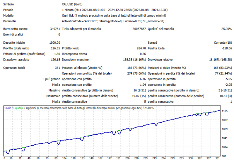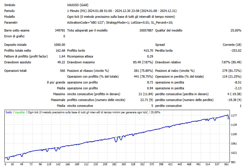 Per garantire trasparenza e affidabilità, XBot XAU Gold Recovery è stato sottoposto a rigorosi test su dati storici reali dell’intero anno 2024, utilizzando condizioni di mercato realistiche e gestione del rischio coerente con ciascuna modalità operativa.